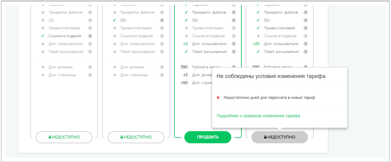 Если условия нового тарифа не соблюдены, появится кнопка “Недоступно ”. По наведению курсора появится подсказка, что необходимо изменить для смены тарифа.